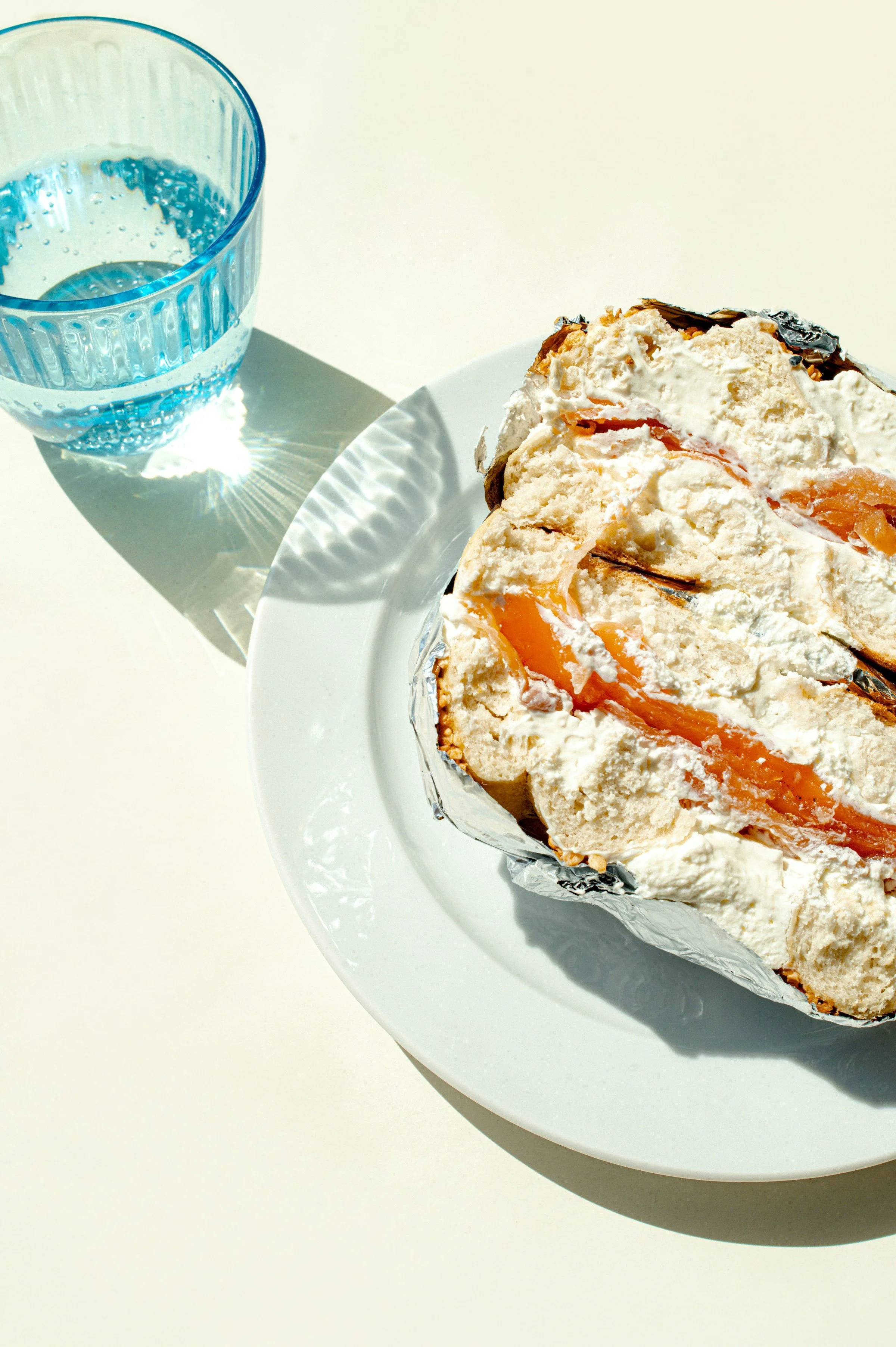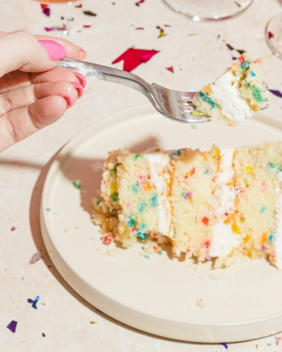 Kakku lautasella ja haarukka, jossa kakkupala koristeellisilla strösseleillä