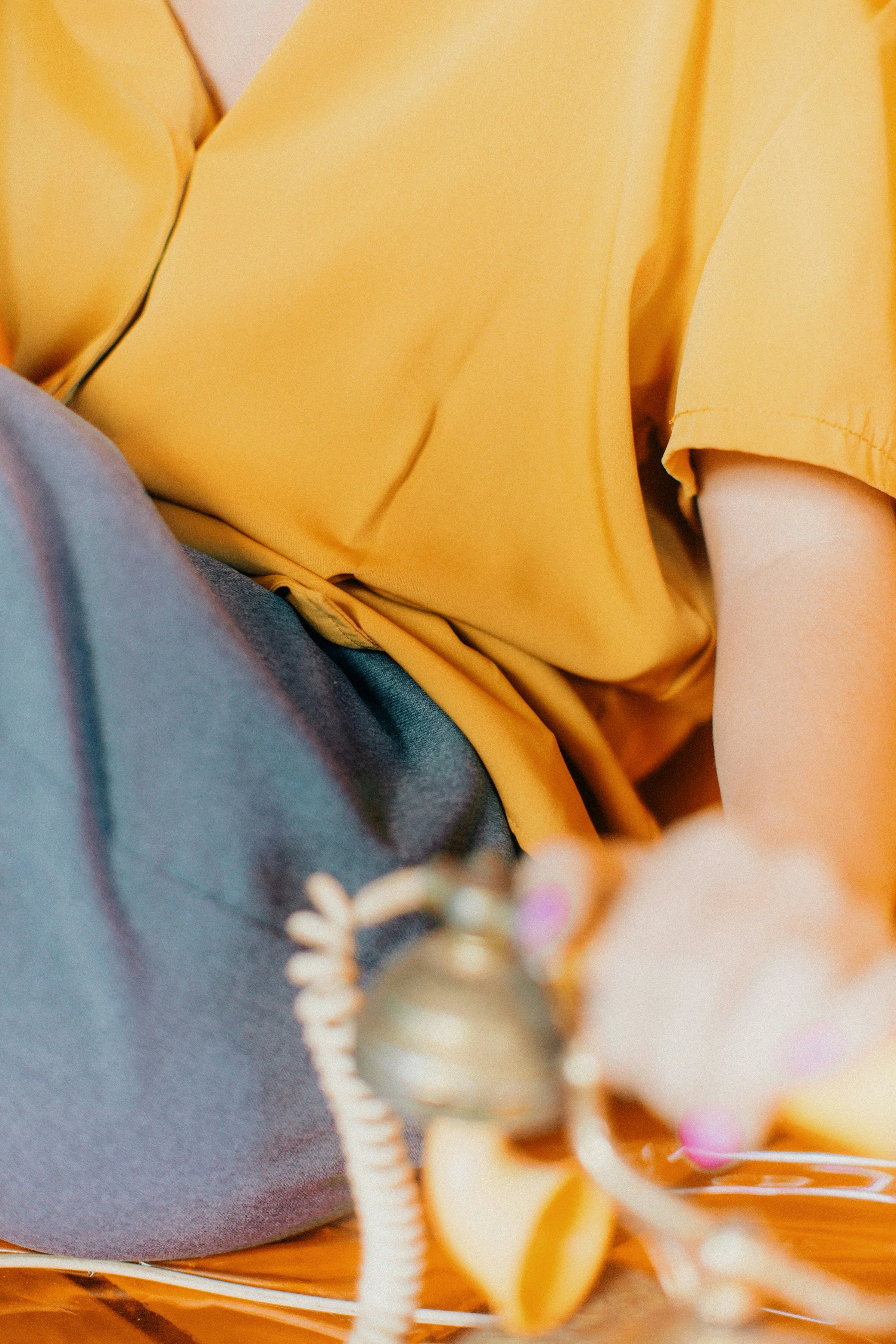 Henkilö pukeutunut keltaiseen paitaan pitää kiinni vanhanaikaisesta puhelimesta.
