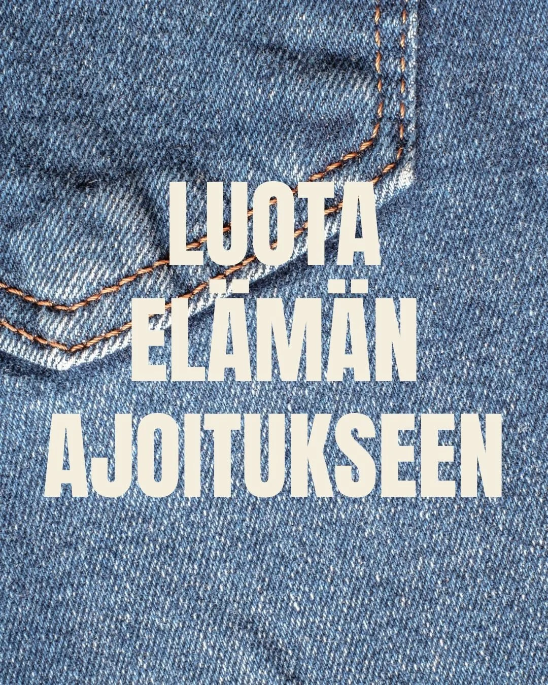 Siniset farkut, teksti "LUOTA ELÄMÄN AJOITUKSEEN" vaalealla tekstillä.